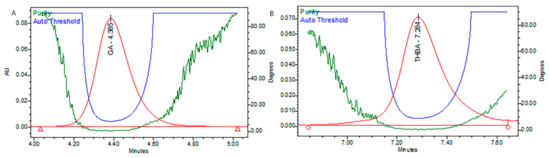 Purity plots of representative peaks, (A) gallic acid, and (B) trihydroxybenzoic acid.