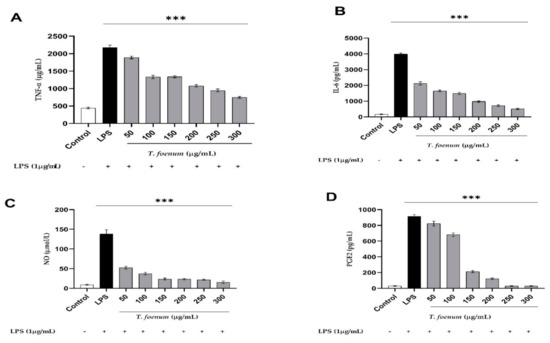 For measurement of NO and PGE2, RAW264.7 cells were (2 × 105) seeded in DMEM medium with 10% of FBS, streptomycin (100 μg/mL) and penicillin (100 units/mL) solution for 24 h, and next different concentrations of T. foenum-graecum (50–300 µg/mL) and standard dexamethasone (10–60 µg/mL) were added, and cells were stimulated with LPS (1 µg/mL) for 24 h at 5% CO2. After 24 h, plate was centrifuged, and supernatant was collected and analyzed for NO and PGE2 [35,36].