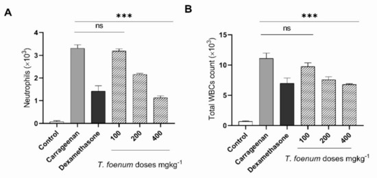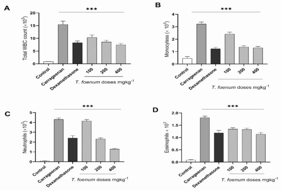Animals (randomly assigned into six groups) were pretreated orally with T. foenum-graecum seed extract (100, 200, 400 mg/kg BW), saline solution (0.9%, placebo control) and dexamethasone (20 mg/kg BW, standard group) before 30 min of intraperitoneal injection of carrageenan. Then, animals were slaughtered after 4 h of carrageenan injection, and peritoneal cavities of animals were washed with normal saline solution. Cellular count was performed in peritoneal fluid by dissolving 20 µL of peritoneal fluid in Turk’s solution (0.38 mL). The collected peritoneal fluid was centrifuged at 10,000 rpm for 10 min and stored at −8 °C for analysis of oxidative stress and lipid per-oxidation parameters [40].