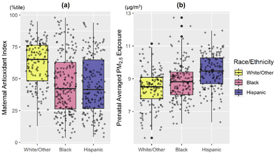 Distribution of maternal antioxidant intake and prenatal PM2.5 exposure averaged across pregnancy by maternal race/ethnicity. Boxplots of (a) maternal composite antioxidant index and (b) prenatal PM2.5 exposure averaged across pregnancy, stratified by maternal race/ethnicity (Black: Black/Hispanic Black; Hispanic: non-Blank Hispanic; White/Other: non-Hispanic White/other race). Bottom line and upper line of the box denote 25th percentile (Q1) and 75th percentile (Q3) of the distribution, while the thick line within the box denotes median. Lower and upper whiskers of the vertical line denote Q1 − 1.5*IQR and Q3 + 1.5*IQR, while the dark black dots represent potential extreme values. IQR: interquartile range. Kruskal–Wallis test indicated that maternal antioxidant index and averaged prenatal PM2.5 among racial/ethnic subgroups are significantly different (both p < 0.001).