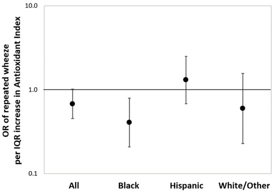 Associations between maternal antioxidant index (AI) score and children’s repeated wheeze. Results from multivariable-adjusted logistic regressions examining associations between maternal AI score and children’s repeated wheeze in the sample overall and stratified by race/ethnicity (Black: Black/Hispanic Black; Hispanic: non-Blank Hispanic; White/Other: non-Hispanic White/other race). Solid dot denotes odds ratio (OR) of repeated wheeze per interquartile range (IQR) increase in AI score, and the error bars denote 95% confidence interval (95% CI). The models were adjusted for child sex, maternal age at delivery, education status, maternal history of asthma (and race/ethnicity in the overall model). IQR of antioxidant index: 39.3 (percentile).