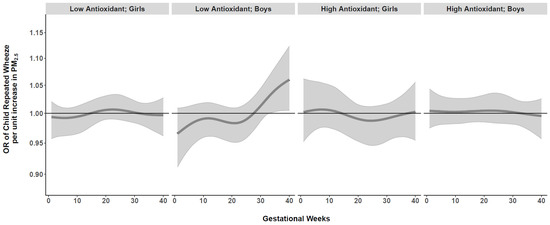 Antioxidant- and sex-specific time-varying odds ratios (95% CIs) of child’s repeated wheeze per µg/m3 increase in prenatal weekly averaged PM2.5 levels across gestation in Black mothers. Antioxidant- and sex-specific time-varying associations between prenatal weekly PM2.5 exposure and children’s repeated wheeze were estimated by a BDLIM among Black mothers, adjusting for maternal age at delivery, education, asthma history, and prenatal averaged temperature. The x-axis demarcates gestational age in weeks. The y-axis represents the odds ratio (OR) of repeated wheeze per 1 µg/m3 increase in prenatal PM2.5 exposure. The solid line represents the predicted effect estimate, and the gray area indicates the 95% confidence interval (CI). A significant exposure window is identified for the time periods where the estimated pointwise 95% CI (shaded area) does not include 1. Results indicated a significant exposure window at 33–40 weeks gestation in boys born to Black mothers with low antioxidant intake.
