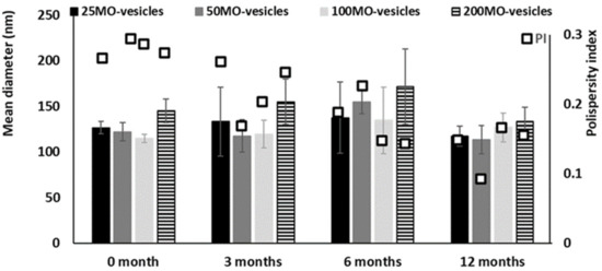| 200MO-vesicles | ° 145 ± 14 | 0.29 | −25 ± 3 | 100 ± 1 |