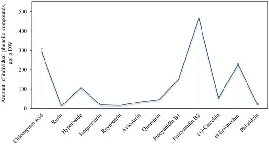 The total amount of flavonols identified and quantified in the apple extracts was 238.8 ± 11.9 µg/g, which accounted for 16.4% of the total phenolic compounds detected (Figure 1). The flavonols identified and quantified in the apple extracts can be ranked by their amount in the following ascending order: rutin < reynoutrin < isoquercitrin < avicularin < quercitrin < hyperoside. Hyperoside was the prevailing compound among flavonols in the apples from the cultivar selected for this study. Our results are consistent with those of previously published studies [29]. The content of the identified and quantified chlorogenic acid was 290.4 ± 14.5 µg/g, which accounted for 20.0% of the total phenolic compounds detected (Figure 1). Tsao et al. determined that chlorogenic acid reaches 21.0–90.0% of the total content of phenolics in apples. [30]. Similarly, Rana et al. determined that the level of chlorogenic acid in apples ranges from 106.8 µg/g to 198.9 µg/g [31]. The dihydrochalcone group compound phloridzin was also identified in the apple extracts. Its content in the samples was 21.5 ± 1.1 µg/g, accounting for only 1.5% of the total phenolic compounds found in the apple samples (Figure 1). Piccolo et al. established that the amount of phloridzin in apples varies from 10.0 µg/g to 50.0 µg/g, confirming the results of our study [32]. The dihydrochalcone group compounds can be chosen as chemotaxonomic markers in the taxonomy of apple species, as well as for the appreciation of apple products and their quality [33].