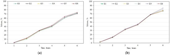 After the analysis of the qualitative and quantitative composition of the biologically active compounds in the apple extracts, an in vitro release test of phenolic compounds from the gels and emulgels was performed during the next phase of the study. The test showed that the largest amounts of phenolic compounds were released from gels G1–G6 and emulgels E1–E6 after 6 h (Figure 2). We found that fewer phenolic compounds were released from the G1–G6 formulations (70.6–73.8%) compared to the amount (77.2–83.9%) released from the E1–E6 formulations (Figure 2). The largest amount (83.9%) of phenolic compounds was released from the E5 formulation (Figure 2, Panel b), while the smallest amounts (70.6%) were released from formulations G3 and G5 (Figure 2, Panel a). The in vitro release test showed that during the 1–4 h interval, both G1–G6 and E1–E6 formulations released statistically insignificant amounts of phenolic compounds, while after 5–6 h, larger amounts of phenolic compounds were released from the E1 –E6 formulations than from the G1–G6 formulations (Figure 2).