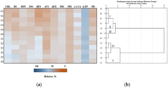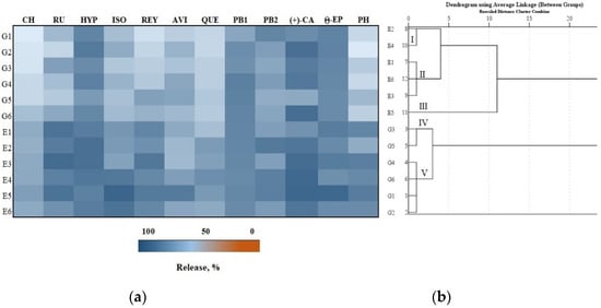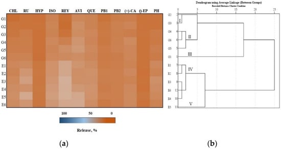 From the total amount of phenolic compounds released after 2, 4 and 6 h, the percentage release of the predominant biologically active compounds from the formulations was determined. Depending on the total amount released after 2, 4, and 6 h, a hierarchical cluster analysis was performed. We found that from the total amount of phenolics released after 2 h, avicularin was the predominant flavonoid (Figure 3, Panel a). The comparison of the amounts of individual phenolic compounds released from the test formulations showed that the largest amount (29.5%) of reynoutrin was released from the E5 formulation. Meanwhile, the lowest amount (7.7%) of chlorogenic acid was released from the G1 formulation compared to the amounts of the other individual phenolic compounds released from the test formulations (Figure 3, Panel a).