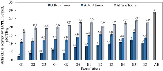 Antiradical activity evaluated in gel (G1–G6) and emulgel (E1–E6) formulations and in 1% apple extract (AE) by the DPPH method. The means followed by different uppercase and lowercase letters are significantly different at p < 0.05.