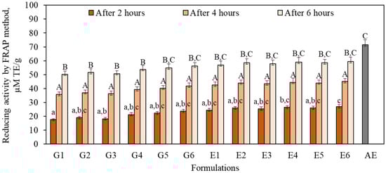 The reducing activity determined by the FRAP method in the gel (G1–G6) and emulgel (E1–E6) formulations after 2, 4 and 6 h and in the 1% apple extract ranged from 17.8 μM TE/g to 71.5 μM TE/g (Figure 7). The strongest reducing activity evaluated by the FRAP method (71.5 μM TE/g) was found in 1% AE. Xu et al. found that the reducing activity found by the FRAP method in apple flesh and peel samples varied from 36.5 μM TE/g to 75.9 μM TE/g [51]. Previous data showed that in 13 apple cultivars, FRAP values varied between 50.5–192.0 and 71.8–137.7 µM TE/g in the flesh and the peel, respectively [52]. After 2 h, all the gel (G1–G6) and emulgel (E1–E6) formulations had weaker reduction activity, evaluated with the FRAP method, compared with the activity found in the formulations after 4 or 6 h (Figure 7). After 4 h, the reducing activity determined by the FRAP method in all the gel (G1–G6) and emulgel (E1–E6) formulations did not differ with any statistical significance. Stronger reducing activity was observed in all the gel (G1–G6) and emulgel (E1–E6) formulations after 6 h compared to the activity found in the formulations after 2 or 4 h. After 6 h, the strongest reducing activity (59.9 ± 2.9 μM TE/g) was found in formulation E6 (Figure 7).