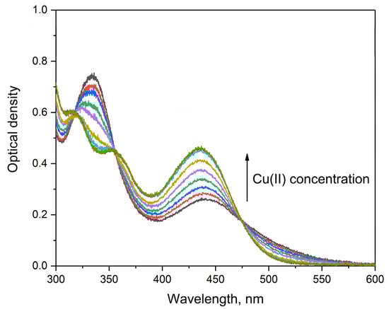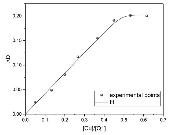 The dependencies of the relative change of the ligand absorption (∆D) on Cu(II)/Q1 concentration ratio at 435 nm were obtained and fitted via expression (14) (See Section 2.4 for details). Experimental points and fitting curves for ethanol solution are presented in Figure 3. Similar results were obtained in the water–ethanol mixture.