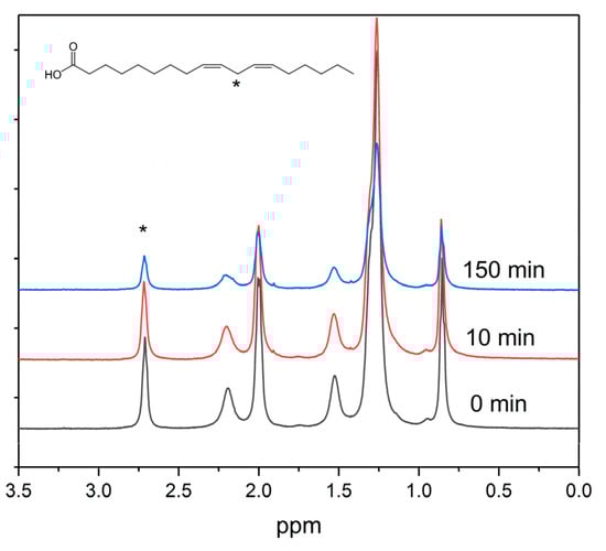 Lipid micelles are a common model mimicking the biological membrane properties []. LA is an example of a polyunsaturated fatty acid where the peroxidation is well described [,]. In the present study, examining the peroxidation of LA (3.5 mM) was performed in the presence of H2O2 (0.5 M) and FeSO4 (0.1 mM) at 25 °C (pH 7.4). The analysis of the kinetic of LA peroxidation was performed with the approach described in []. Briefly, the time dependence of the intensity of the NMR signal of bis-allylic protons of LA (Figure 4, 2.7 ppm, asterisk) was measured. Since the initiation stage of LA oxidation is the abstraction of a hydrogen atom at this position, and reaction products (lipid radicals and conjugated dienes, Equations (1)–(4)) do not contain such protons in the structure, the initiation stage leads to a decrease in the intensity of this signal as a function of time (Figure 5). Control experiments using the mixture of LA + Fe(II) in the absence of H2O2 demonstrated no decrease in the intensity of LA signals in the spectrum during 24 h at 25 °C.