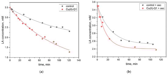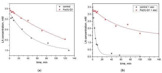 The kinetics of LA (3.5 mM) peroxidation at pH 7.4 in the reaction with H2O2 (0.5 M)/25 °C were measured for Fe(II) (as FeSO4; 0.1 mM) and for iron complex of Q1 (0.1 mM, i.e., [ligand] = 0.2 mM and [Fe] = 0.1 mM), in the absence (Figure 5a) or presence (Figure 5b) of ascorbate (2.5 mM). The experimental points were approximated by an exponential decay, and the first-order reaction rate constants have been obtained from fitting the parameters using the Levenberg–Marquardt algorithm. The calculated reaction rate constants are given in Table 2.