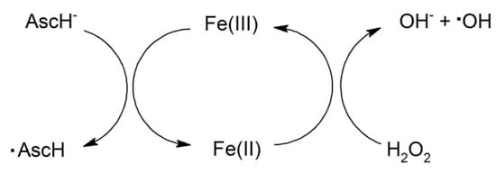 The ability of AA to reduce ferric and cupric ions results in a significant increase in the yield of reactive oxygen species (ROS) in metal-induced redox reactions (Scheme 1) [,]. In particular, the increase of highly toxic hydroxyl radical (•OH) production in the Fenton reaction [,,] has been demonstrated by the EPR spin trapping technique [].