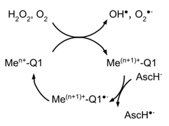 The scheme of ROS generation during the interaction of quinone Q1 with electron donors in the presence of metal ions (Me) and ascorbate in the system.