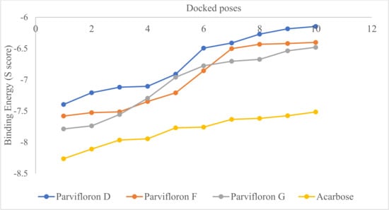 Top ten docked poses of parvifloron D, parvifloron F, parvifloron G, and acarbose on the x-axis plotted against the binding affinity (S score) for alpha-glucosidase. The greater the negative value of S score, the stronger the predicted binding affinity for alpha-glucosidase. Among the isolated compounds, parvifloron G showed more poses with lower S scores.