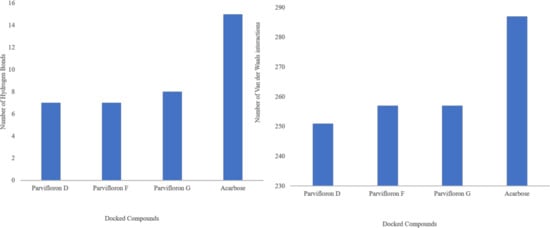 In a detailed look into the binding of the top docked poses of the isolated compounds and acarbose to the macromolecular target, alpha-glucosidase revealed hydrogen bond (at a minimum distance of 2.5 Å and 20° angle) and Van der Waals (at minimum overlap of −0.4 Å) interactions with amino acid residues at the binding site (Figure 3). A count of the various types of interactions with the binding site of alpha-glucosidase (Figure 4) showed that the reference compound acarbose had the most number and types of interactions. Parvifloron D and parvifloron F showed a total of seven hydrogen bond interactions while parvifloron G showed eight hydrogen bond interactions (Figure 2). These results suggest that although the reference compound acarbose might have the strongest interaction with alpha-glucosidase, parvifloron G showed the highest affinity for the target—higher than parvifloron F and parvifloron D.