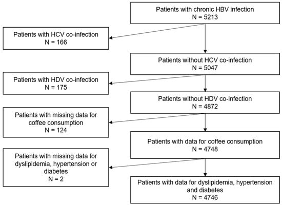 The main exclusion criterion in Hepather was HIV coinfection. For the present study, the study population comprised patients with chronic HBV virus infection at cohort enrolment (defined by positive HBsAg for at least six months). Patients with HCV or HDV coinfection were excluded from the study population, as were patients with no data on coffee consumption and those with unavailable data for the three outcomes (i.e., dyslipidemia, hypertension, and diabetes).