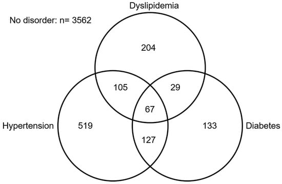 Participants’ characteristics according to their coffee consumption level are provided in Table 1. Most were men (63.3%), and the median age was 43 years (interquartile range [34,35,36,37,38,39,40,41,42,43,44,45,46,47,48,49,50,51,52,53,54]). Just over a quarter (26.8%) had elevated coffee consumption, while 39.1% had daily tea consumption. A quarter (24.9%) had at least one metabolic disorder, the most prevalent being hypertension (Figure 2). Characteristics of included vs. excluded participants are given in Supplementary Table S1.
