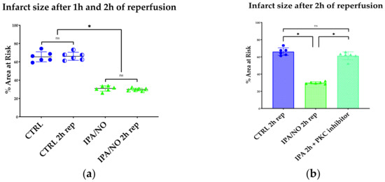(a) Infarct size expressed as a percentage of the area at risk (left ventricle mass). Neither the CTRL nor IPA/NO-treated heart showed a significant difference in terms of necrosis after 2 h of reperfusion when compared to 1 h. n = 6 for each experimental group. Data are expressed as Average ± Standard Deviation. * p < 0.001, ns: non-significant. (b) Infarct size expressed as a percentage of the area at risk (left ventricle mass). IPA/NO protection is abolished by co-infusion of a specific inhibitor of PKC translocation. N = 6 for each experimental group. Data are expressed as Average ± Standard Deviation. * p < 0.001, ns = p > 0.05.