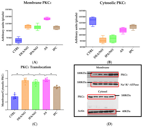 (A) Quantification of membrane PKCε in myocardial tissue of ischemic hearts. Isolated hearts perfused with DEA/NO, IPA/NO, AS, or preconditioned with IPC. Membrane PKCε is higher in all treatments when compared to the CTRL group. All readings have been performed in triplicate maintaining the same ROI. (B) Quantification of cytosolic PKCε in myocardial tissue of ischemic hearts. Isolated hearts perfused with DEA/NO, IPA/NO, AS, or preconditioned with IPC. Cytosolic PKCε is lower in all treatments when compared to the CTRL group. All readings have been performed in triplicate maintaining the same ROI. (C) Ratio of membrane/cytosolic PKCε in myocardial tissue of ischemic hearts. Isolated hearts perfused with DEA/NO, IPA/NO, AS, or preconditioned with IPC. The ratio is significantly increased in all groups compared to the CTRL (p < 0.0001). All donors also show a significantly higher PKCε translocation when compared to IPC (* p < 0.001, ns = p > 0.05). (D) Representative images of Western blot membraned incubated with specific antibodies and revealed in chemiluminescence.