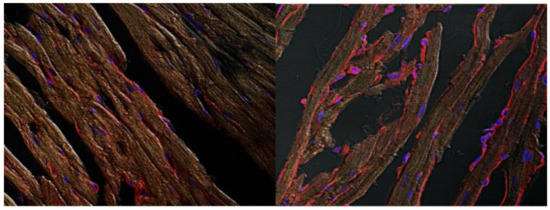Visualization of PKCε translocation induced by the novel compound IPA/NO. After treatment, hearts were processed to obtain thin slices to be probed with a PKCε antibody. Images were taken by confocal microscopy at 63×. In the left panel, a representative image on untreated, myocardial tissue, in the right panel a IPA/NO treated heart.