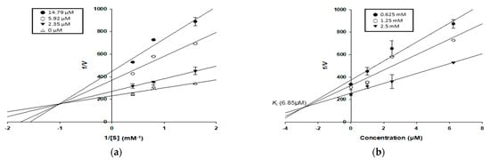 - Dixon, M. The determination of enzyme inhibitor constants. Biochem. J. 1953, 55, 170. [Google Scholar] [CrossRef]