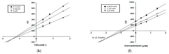 Lineweaver–Burk plots (a,c,e,g,i,k) and Dixon plots (b,d,f,h,j,l) of α-glucosidase inhibition by compounds 1–3 and 5–7, respectively: (a,b) for kuwanon C (1); (c,d) for moracin M (2); (e,f) for dihydromorin (3); (g,h) for oxyresveratrol (5); (i,j) for norartocarpetin (6); (k,l) for kuwanon G (7).