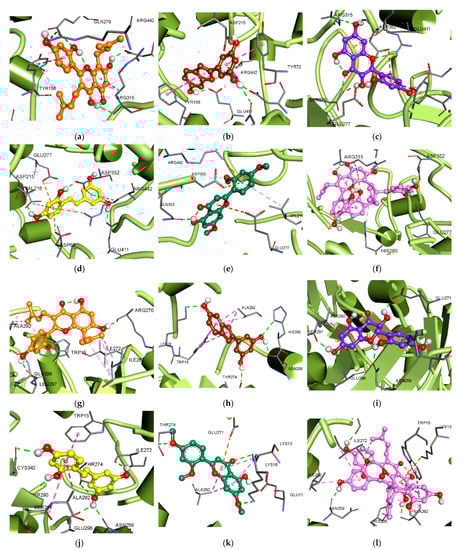 Molecular docking models of α-glucosidase inhibition at catalytic (a–f) and allosteric sites (g–l) by compounds 1–3 and 5–7, respectively: (a,g) for kuwanon C (1); (b,h) for moracin M (2); (c,i) for dihydromorin (3); (d,j) for oxyresveratrol (5); (e,k) for norartocarpetin (6); (f,l) for kuwanon G (7).