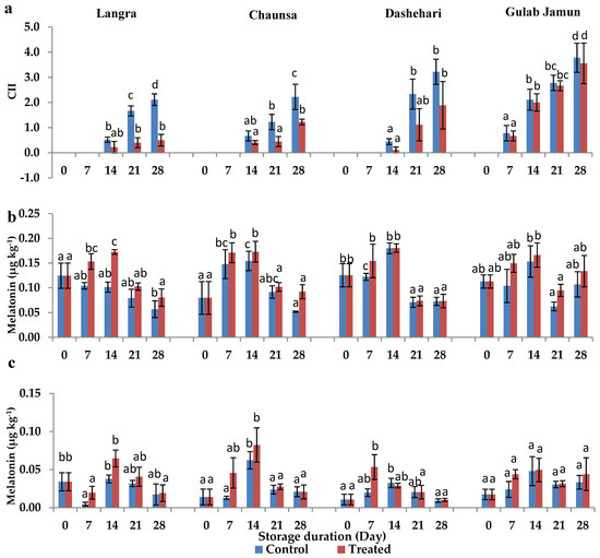 Most fruits treated with MT showed significant (p < 0.05) reduction in CI signs, except for the ‘Gulab Jamun’ cultivar (Figure 1a). Treated ‘Langra’, ‘Chaunsa’, ‘Dashehari’, and ‘Gulab Jamun’ mangoes had 4.8, 1.8, 1.7, and 1.1 times less CII severity, respectively, after 28 d of cold storage at 5 ± 1 °C. It is therefore apparent that ‘Langra’ mangoes showed maximum tolerance to CI in response to the application of MT, followed by ‘Chaunsa’ and ‘Dashehari’ mangoes.