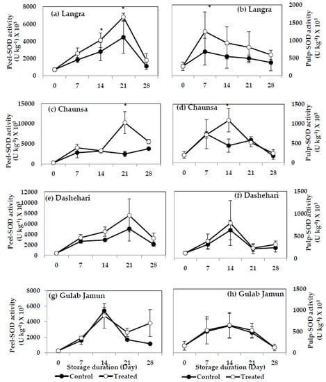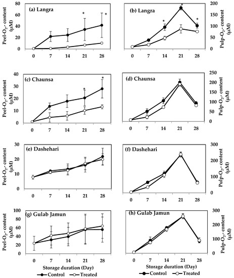 Effect of 100 µM melatonin treatment on O2·− content in (a) ‘Langra’ peel, (b) ‘Langra’ pulp, (c) ‘Chaunsa’ peel, (d) ‘Chaunsa’ pulp, (e) ‘Dashehari’ peel, (f) ‘Dashehari’ pulp, (g) ‘Gulab Jamun’ peel, and (h) ‘Gulab Jamun’ pulp during storage at 5 ± 1 °C plus 3 d of shelf life at room temperature. Data are the mean of three replicates ± standard error. An asterisk (*) on the same storage period indicates significant differences (p < 0.05).
