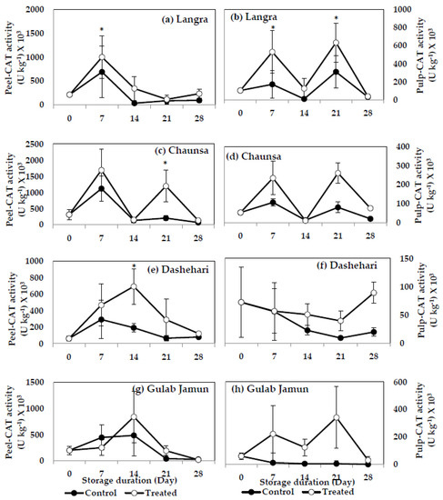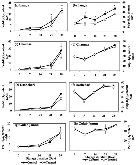 H2O2 content in (a) ‘Langra’ peel, (b) ‘Langra’ pulp, (c) ‘Chaunsa’ peel, (d) ‘Chaunsa’ pulp, (e) ‘Dashehari’ peel, (f) ‘Dashehari’ pulp, (g) ‘Gulab Jamun’ peel, and (h) ‘Gulab Jamun’ pulp as affected by 100 µM melatonin (MT) treatment during storage at 5 ± 1 °C plus 3 d of shelf life at room temperature. Data are the mean of three replicates ± standard error. An asterisk (*) on the same storage period indicates significant differences (p < 0.05).