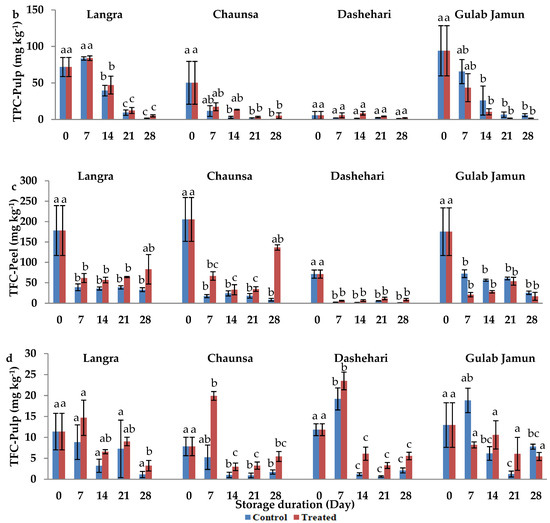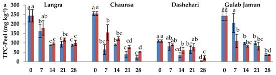 The TFC of peel was significantly higher in MT-treated fruit at the 28 d of observation in ‘Langra’ mangoes, and all observed days in ‘Chaunsa’ mangoes (Figure 4c). In contrast, no statistically significant effect was apparent on MT-treated ‘Dashehari’ or ‘Gulab Jamun’ mangoes on 21 and 28 d of observation. In the pulp of MT-treated mangoes (Figure 4d), TFC increased on some days of observation in ‘Langra’ and ‘Chaunsa’ mangoes, no effect was found on ‘Dashehari’ mangoes, and a decrease on some days was found on ‘Gulab Jamun’ mangoes.