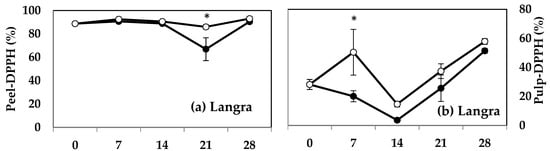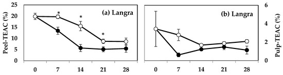 The effect of MT treatment on H2O2 content was significant only for the ‘Langra’ cultivar, in which lower values of H2O2 were observed in the pulp during the whole storage. However, for the remaining cultivars the peel and pulp of mangoes did not show any significant response to the MT treatment, regarding their H2O2 content (Figure 3c,d).