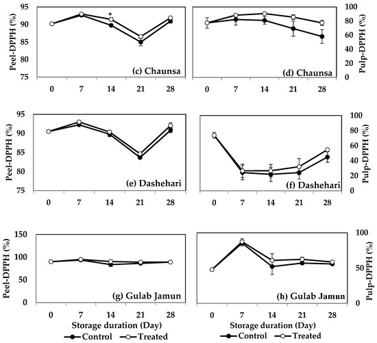 DPPH assay in (a) ‘Langra’ peel, (b) ‘Langra’ pulp, (c) ‘Chaunsa’ peel, (d) ‘Chaunsa’ pulp, (e) ‘Dashehari’ peel, (f) ‘Dashehari’ pulp, (g) ‘Gulab Jamun’ peel, and (h) ‘Gulab Jamun’ pulp as affected by 100 µM melatonin (MT) treatment during storage at 5 ± 1 °C plus 3 d of shelf life at room temperature. Data are the mean of three replicates ± standard error. An asterisk (*) on the same storage period indicates significant differences (p < 0.05).