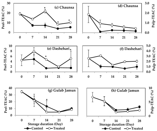 Effect of 100 µM melatonin (MT) treatment on Trolox equivalent antioxidant capacity (TEAC) assay in (a) ‘Langra’ peel, (b) ‘Langra’ pulp, (c) ‘Chaunsa’ peel, (d) ‘Chaunsa’ pulp, (e) ‘Dashehari’ peel, (f) ‘Dashehari’ pulp, (g) ‘Gulab Jamun’ peel, and (h) ‘Gulab Jamun’ pulp t during storage at 5 ± 1 °C plus 3 d of shelf life at room temperature. Data are the mean of three replicates ± standard error. An asterisk (*) on the same storage period indicates significant differences (p < 0.05).
