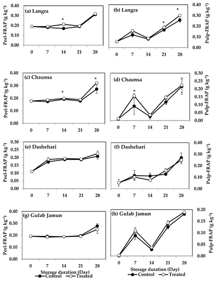 Ferric-reducing antioxidant power (FRAP) in (a) ‘Langra’ peel, (b) ‘Langra’ pulp, (c) ‘Chaunsa’ peel, (d) ‘Chaunsa’ pulp, (e) ‘Dashehari’ peel, (f) ‘Dashehari’ pulp, (g) ‘Gulab Jamun’ peel, and (h) ‘Gulab Jamun’ pulp as affected by 100 µM melatonin (MT) treatment during storage at 5 ± 1 °C plus 3 d of shelf life at room temperature. Data are the mean of three replicates ± standard error. An asterisk (*) on the same storage period indicates significant differences (p < 0.05).