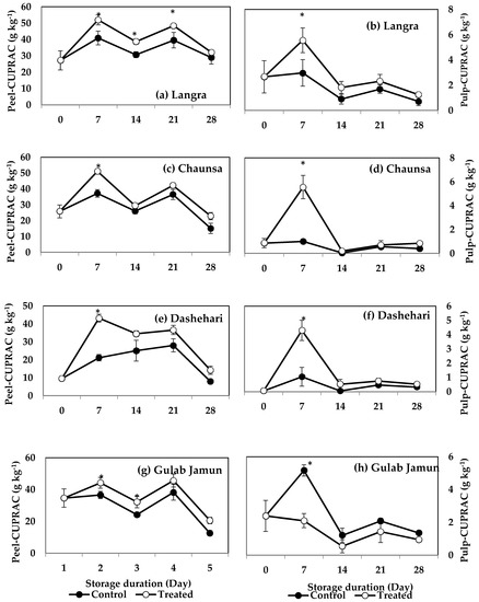 The peel of MT-treated ‘Langra’ (Figure 6a), ‘Chaunsa’ (Figure 6c), and ‘Dashehari’ (Figure 6e) mangoes had significantly higher TEAC values, on at least one day of observation. In contrast, the peel of MT-treated ‘Gulab Jamun’ mangoes had a significantly lower TEAC value at 14 d of observation (Figure 6g). In the case of pulp of most MT-treated mangoes (Figure 6b,d,f), except for ‘Gulab Jamun’ (Figure 6h), no significant differences were found (p > 0.05), although a tendency towards increasing is apparent.
