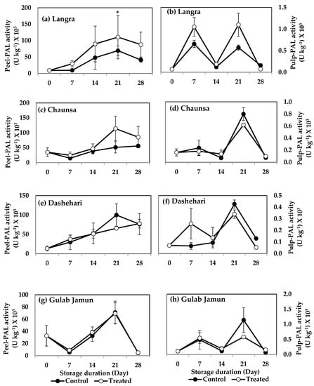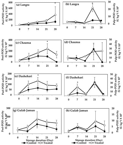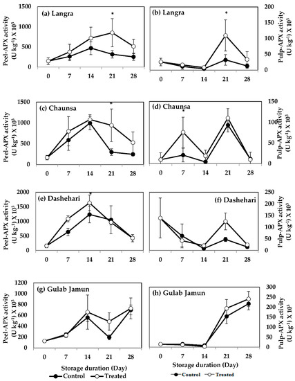 Effects of 100 µM melatonin treatment on ascorbate peroxidase (APX) activity in (a) ‘Langra’ peel, (b) ‘Langra’ pulp, (c) ‘Chaunsa’ peel, (d) ‘Chaunsa’ pulp, (e) ‘Dashehari’ peel, (f) ‘Dashehari’ pulp, (g) ‘Gulab Jamun’ peel, and (h) ‘Gulab Jamun’ pulp during storage at 5 ± 1 °C plus 3 d of shelf life at room temperature. Data are the mean of three replicates ± standard error. An asterisk (*) on the same storage period indicates significant differences (p < 0.05).