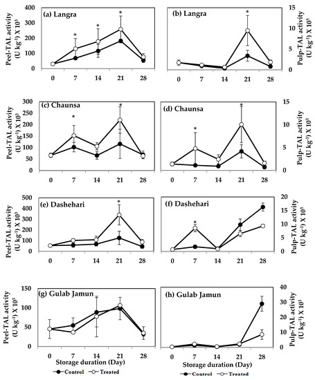 Both phenylalanine ammonia lyase (PAL, EC 4.3.1.5) and tyrosine ammonia lyase (TAL, EC 4.3.1.25) were assayed, according to the protocol reported by Khan et al. [34], with some modifications. An extract was initially performed, where 1 g of mango fruit tissue (peel or pulp) was homogenised in ice-cooled Tris-HCl buffer (50 mM, pH 8.5) containing 5% (w/v) polyvinylpolypyrrolidone (PVPP) and 14.4 mM β-mercaptoethanol. The mixture was centrifuged at 10,000× g, at 4 °C, for 20 min, and the supernatant recovered was used to quantify PAL and TAL activities.