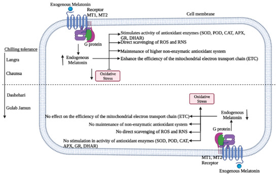 High endogenous MT content after MT treatment could lead to membrane integrity maintenance in most mango cultivars, except for ‘Gulab Jamun’. Tan et al. [49] and Galano et al. [50] established the relationship between the antioxidant activity of MT against ROS and reactive nitrogen species (RNS), in addition to acting as a signalling molecule when the fruit were subjected to stress, similar findings to the ones reported in the present work. The antioxidant activity of MT has been reported to be due to different mechanisms of action, as follows: (1) by directly scavenging ROS and RNS, (2) by stimulating the activity of antioxidant enzymes, (3) by maintaining the non-enzymatic antioxidants in a reduced state, and (4) by preventing ROS formation on the mitochondrial electron transport chain (ETC). These complementary mechanisms collectively prevent ROS and RNS formation, and/or mitigate their oxidative damage [49,50,51].