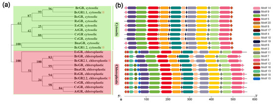 Four GR genes in non-heading Chinese cabbage were identified, and named BcGR1.1, BcGR1.2, BcGR2.1 and BcGR2.2. The results of phylogenetic tree analysis and the differential distribution of conserved motifs indicate that the GRs of non-heading Chinese cabbage are similar to other varieties, with two subcellular localization types: cytoplasm (Figure 1a, green box) and chloroplast (Figure 1a, pink box). Phylogenetic tree analysis showed that there is a close evolutionary relationship among non-heading Chinese cabbage, Brassica rapa, Brassica napus and Raphanus sativus (Figure 1a). Motif analysis showed that the motifs of BcGRs are overwhelmingly the same as those of other species (Figure 1b). For the cytoplasmic localized GR, there was only a difference in the first motif, motif 13, which was only identified in several other species, except RsGR, CrGR, and CsGR. Chloroplast-localized GR, according to the difference between the fourth and fifth conserved motifs, can be divided into four categories. EsGR, BoGR, BnaGR, RsGR, BcGR2.2, CsGR have exactly the same motifs and belong to the same class; compared with this class, BrGR lacks motif 18 and motif 15, and BcGR2.1 does not contain motif 18, The fourth motif of CrGR and AtGR is motif 10 instead of motif 18.