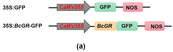 The coding region of the BcGRs was introduced into the pRI101-GFP vector digested by BamHI and NdeI restriction endonucleases, and the construct 35S: BcGR-GFP was obtained. The recombinant plasmid and empty vector were transformed into Agrobacterium GV3101; individual Agrobacterium colonies were grown for 20 h in 500 µL cultures (Luria broth, 50 µg/mL rifampicin, 50 µg/mL kanamycin) at 28 °C. After identification of PCR, they were inoculated in 5 mL culture (Luria broth, 50 µg/mL rifampicin, 50 µg/mL kanamycin) and grown at 28 °C for 16–20 h. Bacteria were pelleted by centrifugation, resuspended in infiltration medium (10 mM MgCl2, 10 mM Mes, 150 µM acetosyringone, pH 5.7) to OD600 = 0.8, and incubated at room temperature for at least 4 h. Using a 1 mL syringe, the Agrobacterium solution was injected from the back of the tobacco leaf into the tobacco by pressure osmosis.