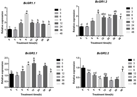Expression patterns of BcGRs genes in the non-heading Chinese cabbage under copper stress. Analysis of BcGRs expression at different time points (0 h, 3 h, 6 h, 9 h, 12 h, 24 h, 36 h and 48 h) under copper stress. The expression levels of BcGRs represented the expression fold of each BcGR in seedlings treated with copper stress at different times, relative to seedlings without copper stress treatment, using the BcGAPC gene as an internal reference gene. The expression level of BcGRs at each timepoint is the average of three replicates. Error bars indicate standard error of mean (SEM) of three independent experiments. According to the LSD test, the values within the same treatment followed by the same letter are not significantly different (p < 0.05).