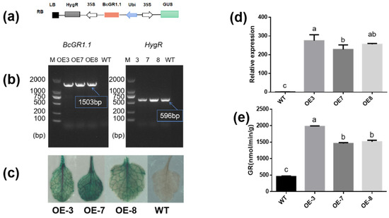 To further study the function of BcGR1.1, we transformed Arabidopsis thaliana by dipping flowers to obtain BcGR1.1-overexpressing plants. For each generation of transgenic plants, DNA level detection (Figure 4b), GUS detection (Figure 4c) and expression analysis (Figure 4d) were performed, respectively. After obtaining the transgenic lines, we tested the GR activity in the WT and transgenic lines. The results showed that the expression levels of BcGR1.1-0E3, BcGR1.1-0E7, and BcGR1.1-0E8 were increased to 274, 228, and 255 times of the WT, and the GR activity were significantly higher than that of the WT, which were 4.3, 3.1, and 3.3 times that of the WT, respectively (Figure 4e).