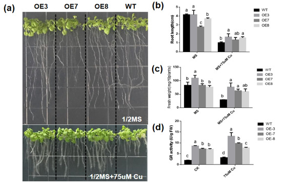 The growth state of Arabidopsis thaliana overexpressing BcGR1.1 gene under copper stress. (a) Image of 21-day growth on half-strength Murashige and Skoog (1/2 MS) medium with or without 75 µM copper sulfate pentahydrate (CuSO4·5H2O). (b) Root growth. (c) Fresh weight. The fresh weight (FW) of wild-type and transgenic plants treated with or without 75 µM CuSO4·5H2O for 21 days. (d) Detection of GR activity in overexpression plants and WT. According to the LSD test, the values within the same treatment followed by the same letter were not significantly different (p < 0.05). Error bars indicate standard error of mean (SEM) of three independent experiments.