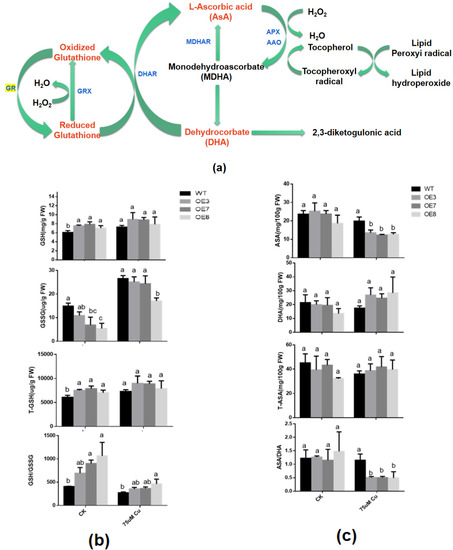 In addition, the ASA-GSH cycle involving GR is closely related to the plants response to adverse environments. Therefore, we tested the content and status of glutathione and AsA, and the results showed that, under copper stress, GSH/GSSG level was upregulated (Figure 6a) and AsA/DHA level was downregulated (Figure 6b) in the transgenic plants. These results indicated that, under copper treatment, the increase in GR activity allows plants to maintain high levels of GSH. At the same time, the AsA-GSH cycle was also affected, and more AsA was used to scavenge ROS, showing high levels of DHA content. These all improve the copper tolerance of plants.