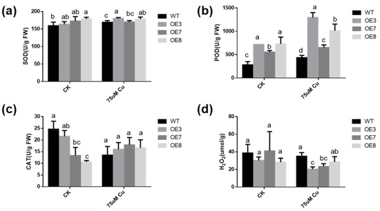 Determination of antioxidant enzyme activity. Analysis of the enzyme activities of SOD (a), POD (b), CAT (c) and the content of H2O2 (d) with or without excessive copper treatment. The plants were sampled and analyzed after exposure to normal or excess copper for 24 h. And the data error is expressed as standard error of mean (SEM). According to the LSD test, there was no significant difference in the values with the same letter after the same treatment (p < 0.05).