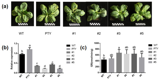 We used VIGS experiment to further study the function of BcGR1.1 in non-heading Chinese cabbage. Two weeks after virus inoculation, PTY-BcGR1.1 and PTY showed a mosaic leaf phenotype (Figure 8a). Plants with potential BcGR1.1 function loss were sampled, and qRT-PCR was used to evaluate the silencing efficiency of BcGR1.1. As shown in Figure 8b, compared with PTY plants, BcGR1.1 expression was significantly reduced by 70.4%, 81.4%, 64.9% and 82.6% in pTY-BcGR1.1#1, #2, #3, and #5 seedlings, respectively. There was no significant difference in GR activity between PTY-BcGR1.1 and PTY plants (Figure 8c), which may be the result of functional complementarity between BcGR homologous genes (Figure S1).