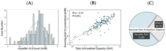Graphs showing the aqueous humor ascorbic acid (AA) concentrations in cataract patients and its correlation to total antioxidant capacity (TAC): (A) histogram showing the left-skewed distribution of aqueous humor AA concentrations in cataract patients with a mean value of 1.198 ± 0.355 mM; (B) scatter plot showing the high correlation between aqueous humor AA concentrations and TAC with a Spearman correlation coefficient of 0.79 (p value < 0.001); (C) pie chart showing the proportional correlation between aqueous humor AA concentrations and TAC. The AA averagely contributed to 71.9% of the aqueous humor TAC in cataract patients.