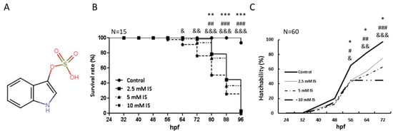 Although the pathological effects of IS have been established using mouse in vivo models, zebrafish (Danio rerio)-based models have been shown to be suitable for high-throughput drug screening and toxicity testing in 96-well plates due to the short growth period and transparent embryos of zebrafish []. Many studies have recently used zebrafish as model organisms to develop new high-throughput screening platforms []. Zebrafish-based in vivo models can be used to assess the physiological and developmental impacts of IS. Zebrafish are tropical freshwater fish that have been widely used in research in recent years as model organisms because they share 70% orthologous gene similarity with humans []. Zebrafish models are used for drug screening []. The organ systems of zebrafish are highly similar to those of humans, and the toxicity of drugs in zebrafish is similar to that in mammals. Zebrafish are becoming widely used biological models for chemical toxicity screening tests []. Furthermore, zebrafish have a central nervous system similar to that of humans, and the two species have high degrees of physiological and genetic homology []. Many biomedical studies have selected zebrafish as experimental animal models to understand human disease patterns []. A database of different transgenic zebrafish and zebrafish mutants with different disease patterns has been created []. Although many studies have reported the use of zebrafish to establish high-throughput screening platforms, such as platforms for angiogenesis and developmental toxicity screening [,,,], a zebrafish model for studying the developmental effects of IS on zebrafish has not been established.