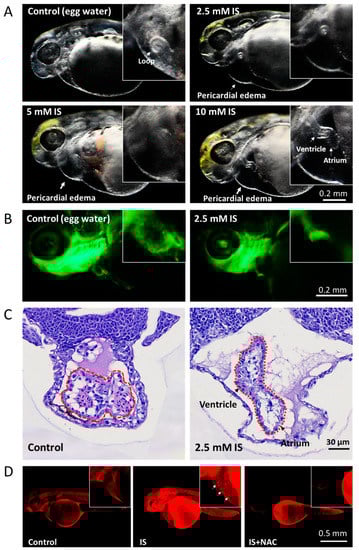 Previous studies have suggested that IS can cause cytotoxicity by activating NAD(P)H oxidase in cells and decreasing glutathione levels to mediate the release of ROS [], resulting in oxidization of substances. To determine whether IS induces ROS production and impairs development in the zebrafish model, we further used the probe DHE to evaluate the level of O2•− in zebrafish embryos. After IS exposure for 24 h, red fluorescence (DHE) was distributed throughout the zebrafish embryos, especially in the epidermis of the head and body and in the pericardium, suggesting that endogenous ROS production in the zebrafish embryos was increased. Pretreatment with 10 μM N-acetylcysteine (NAC), a ROS scavenger, significantly reduced the red fluorescence intensity in zebrafish embryos compared to that in embryos treated with IS alone, confirming that ROS production was induced by IS treatment (Figure 2D).